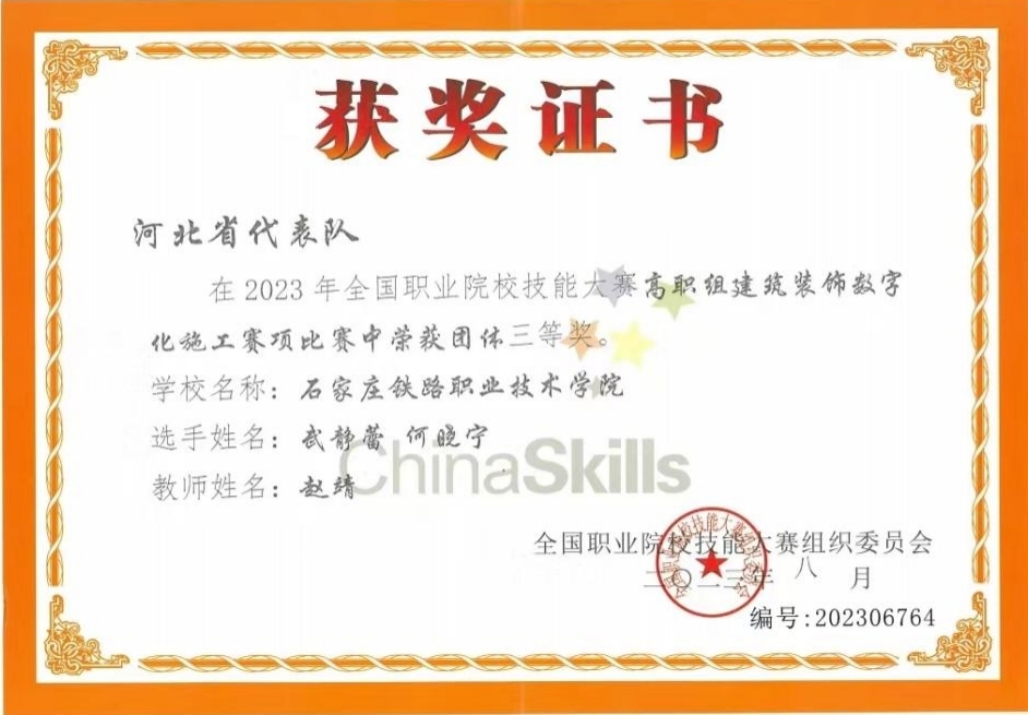 图3 造价师生2023年全国职业院校技能大赛(高职组)“建筑装饰数字化施工”赛项荣获三等奖