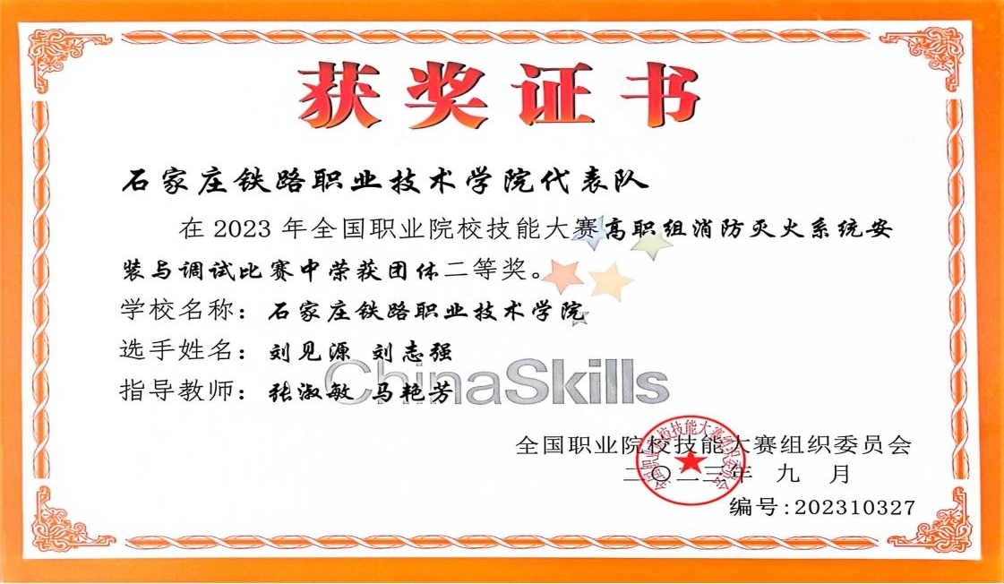 图3 设备师生2023年全国职业院校技能大赛(高职组)“消防灭火系统安装与调试”赛项荣获二等奖